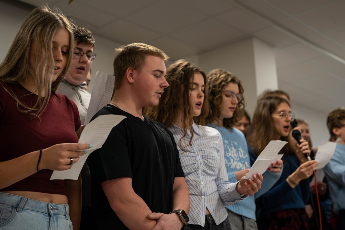 I letos jsme již tradičně koledovali v cizích jazycích. Studenti si pro nás tentokrát připravili 8 cizojazyčních koled, zazněla například německá Im Zauber der Nacht, klasický španělský hit Feliz Navidad, ruská Tichá noc či anglická Merry Christmas everyone. Jako vždy jsme si tyto příjemné předvanoční chvíle společně užili a děkujeme moc všem hudebníkům, zpěvákům, ale i učitelům, kteří koledy nacvičili.
