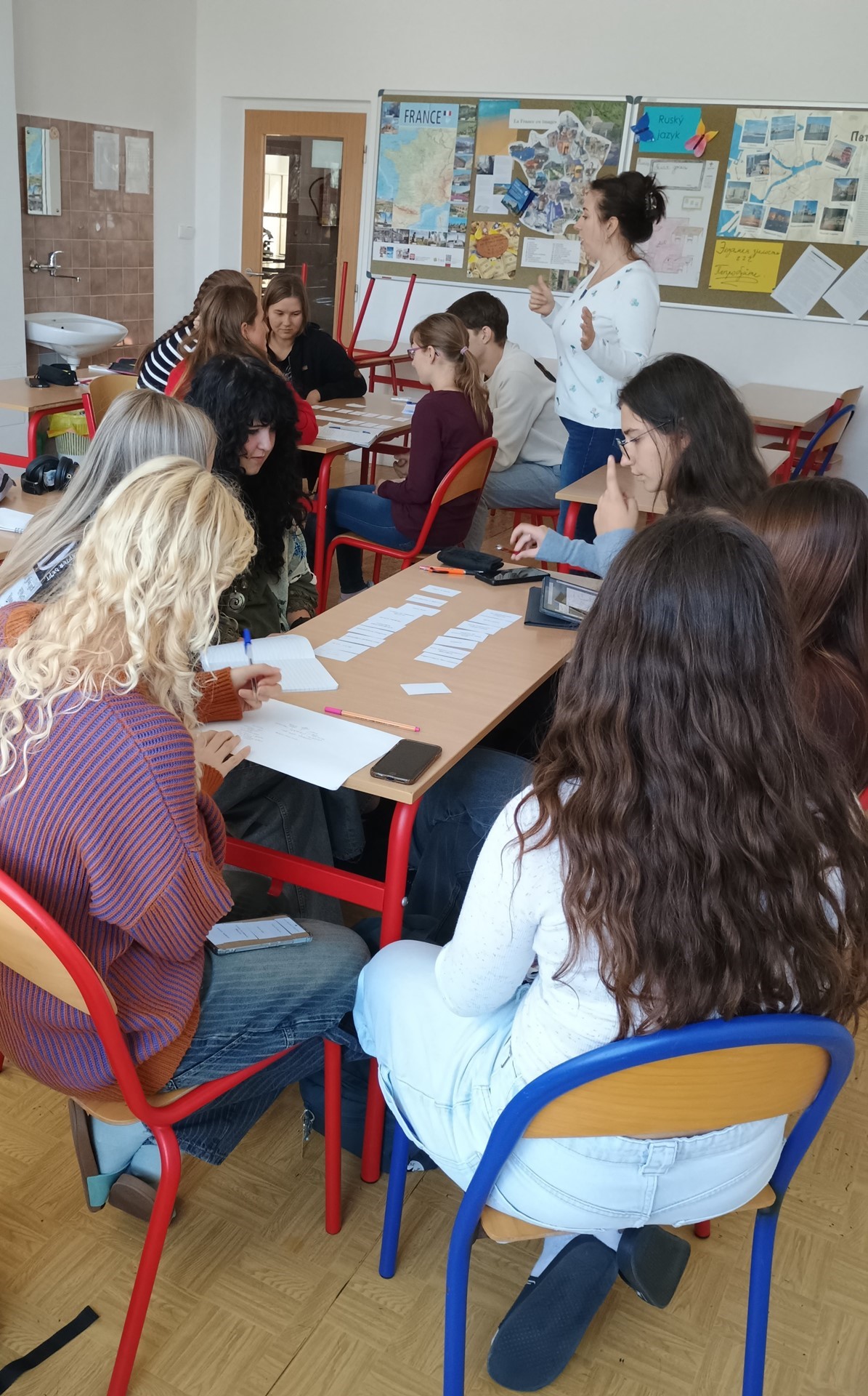 Hodina ruštiny s lektorkou byla zajímavá a přínosná, probírali jsme slovní zásobu a fráze spojené s nemocemi, kartičky nám pomohly lépe si zapamatovat nové výrazy. Nelča
